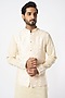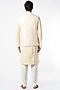 Featuring a pale yellow bundi jacket in art dupion silk base with zari, thread, and floral jaal embroidery. It is paired with off white cotton silk pyjama pants and a kurta. Perfect attire for festive occasion or haldi ceremony, exuding traditional charm and elegance.