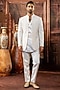 Featuring a beige open-indowestern in raw silk base with pearl work and machine embroidery. It is paired with a kurta and pants. Style it with mojaris for a reception, wedding, sangeet or engagement ceremony.