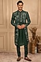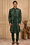 Featuring a bottle green indowestern jacket in dupion silk base with print, mirror and kasab embroidery. It is paired with a kurta and pants. Style it with mojaris for a wedding, mehendi or engagement ceremony.