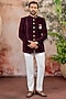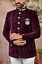 Featuring a maroon jodhpuri in velvet base. It is paired with pants. Style it with mojaris for a reception, wedding, sangeet or engagement ceremony.