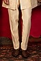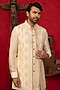 Featuring a peach open-indowestern in dupion silk base with dori and mirror embroidery. It is paired with a kurta and pants. Perfect wear for a wedding, sangeet or engagement ceremony, exuding charm and elegance.