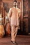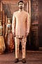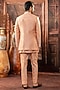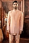 Featuring a peach open-indowestern in dupion silk base with mirror work. It is paired with a kurta and pants. Style it with shoes for a reception, wedding, sangeet or engagement ceremony.