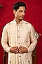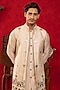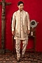 Featuring a peach open-indowestern jacket in dupion silk base with applique and motif work. It is paired with a kurta and pants. Perfect wear for a wedding, sangeet or engagement ceremony, exuding charm and elegance.