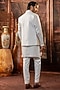 Featuring a peach bundi jacket in japanese fabric base with handpainted. It is paired with a kurta and pants. Style it with mojaris for a wedding, sangeet or engagement ceremony.