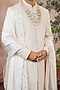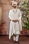 Featuring a peach sherwani in raw silk base with threadwork. It is paired with churidar, anarkali and a dupatta . Style it with mojaris for a wedding or engagement ceremony.