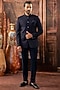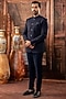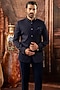 Featuring a teal blue jodhpuri in japanese fabric base. It is paired with pants. Style it with mojaris for a reception, wedding, sangeet or engagement ceremony.