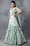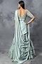 Featuring a powder blue lehenga saree in satin georgette and organza base with fish cut style frills, embroidery, attached draped dupatta, and a cancan. It is paired with a matching net embroidered blouse, and a belt. Perfect wear for festive occasions or wedding ceremonies.