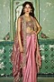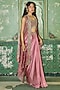 Featuring a blush pink cape in armani satin base, adorned with sequins, thread, dori and pearl embellishments. It is paired with a blouse and a draped skirt. Style this designer set with polki jewellery, metallic high heels and an embellished potli bag, perfect for a sangeet nights, cocktail soirees, or pre-wedding celebrations.