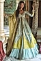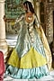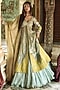 Featuring an ice blue kalidar jacket in pure zari tissue base, adorned with pearl, zari and half-moon motifs embroidery. It is paired with a crushed tissue skirt and a dupatta having lambi gota detailing. Style this designer set with polki jewellery, nude pump heels and an embellished potli bag, perfect for a wedding or engagement ceremony.