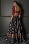 Featuring a midnight blue lehenga in pure silk base. It is paired with a ruby red hand embroidered blouse, an organza lace dupatta and a kamarbandh belt. Accentuate it with pearl jewellery and heels for a wedding or sangeet ceremony.