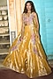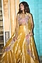 Featuring a mustard yellow cape in pure zari tissue base, adorned with gota-patti embroidery. It is paired with a blouse having dori and sequins work, including sharara pants. Style this designer set with polki jewellery, metallic high heels and an embellished potli bag, perfect for a festive occasion, haldi or engagement ceremony.