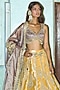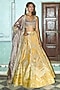 Featuring a mustard yellow kalidar lehenga in pure zari tissue base, adorned with diamond-shape motif, gota-patti and floral embroidery. It is paired with an embroidered blouse having a v-neckline and latkans detail, including a tissue dupatta and a belt, offering a perfect blend of tradition and elegance. Style this designer set with polki jewellery, a floral hairdo and an embellished potli bag, perfect for a wedding or engagement ceremony.