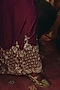 Featuring a purple corset in pure tissue base with 3D floral embellishments. It is paired with a soft silk embroidered pleated draped skirt. Accentuate it with kundan polki jewellery and embellished heels for weddings or sangeet ceremony.