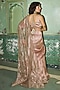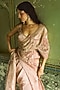 Featuring a rose gold pre-stitched fish-cut saree in crushed silk and tissue base, adorned with thread, dori, gota and sequins embroidery. It is paired with a blouse and a belt. Style this designer set with polki jewellery, metallic high heels and an embellished potli bag, perfect for a sangeet nights, cocktail soirees, or pre-wedding celebrations.