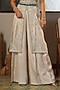 Featuring a dull white cape in organza base with embroidery. It is paired with silk linen box pleated pants and a bustier. Accentuate it with statement earrings and heels for an engagement ceremony.