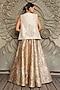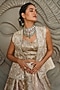 Featuring a light green and gold jacket in tissue base with embellishment. It is paired with a skirt and a crush gota bustier. Accentuate it with statement earrings and heels for a festive look or sangeet ceremonies.