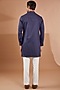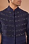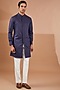 Featuring a navy blue indo-western jacket in raw silk base. It is paired with an italian terry rayon kurta and pants. This attire would be an excellent fit for a wedding or a sangeet ceremony.