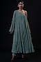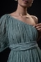 Featuring a turquoise off shoulder kurta in silk and handwoven cotton base with gathers detailing and hand embroidery. It is paired with matching pants and a dupatta.