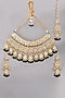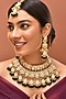Featuring a gold finish necklace studded with green kundan polki, set in copper. It is paired with a pair of earrings and a maangtikka. Ideal for adding a regal touch to wedding celebrations, festive soirees or grand receptions.