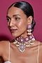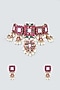 Featuring a gold finish choker necklace studded with red and green kundan polki, set in copper. It is paired with a matching pair of earrings.