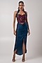 Featuring a wine corset in linen satin and habutai base with print. It is paired with a peacock blue ruched skirt. Accentuate it with statement earrings and heels for a complete look.