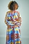 Featuring a red coat dress in polyester and linen base with invisible side pockets, buttons, inverted pleats, and a collar. It has yellow handloom cotton panels. This contains only one piece.