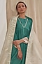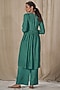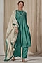 Featuring a teal dyed kurta in muslin silk base with gathers and hand work. It is paired with matching palazzo pants and a tissue silk dupatta.