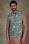 Featuring a blue bundi jacket in linen base with wooden buttons and digital print. Perfect wear for a festive occasion or pooja ceremony.