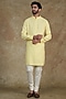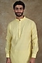 Featuring a lime yellow kurta in self textured cotton base with pleated collar. It is paired with off-white churidar pants. Accentuate it with kolhapuris or embroidered juttis for an elegant yet easy-going look, perfect for pooja ceremonies, festive gatherings or haldi functions.