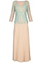Featuring a peach maxi gown in crepe and tulle base with hand embroidery.