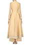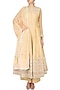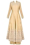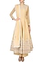 This set features a beige jacket style flared anarkali in silk base embedded with pearl, zari, dabka and dori embroidery in an ornate floral pattern on the yoke, cuff panels and along the hemline. It has a mandarin collar and hook-eye closure detailing on the front placket. It is paired with beige cotton silk palazzo pants along with beige embroidered chanderi dupatta.
