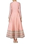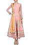 This set features a peach jacket style flared anarkali in silk base embedded with pearl, zari, dabka and dori embroidery in ornate paisley motifs all over the ghera, cuff panels and along the hemline. It has a round neckline and hook-eye closure detailing on the front placket. It is paired with peach cotton silk palazzo pants along with gold embroidered chanderi dupatta.