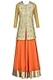 Featuring a gold long jacket in silk with heavy zari and zardozi embroidery and hooks in front. It comes along with coral lehenga skirt in georgette with golden border.