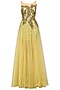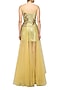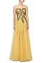 Featuring a gold gown in georgette base with gold sequinned short dress with embroidered bodice layered with net floor length flare.