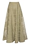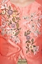 Featuring a candy pink jacket blouse in silk base with patched embroidery. It is paired with contrasting green striped skirt in net base.