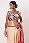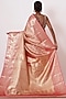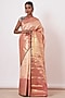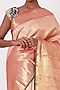 Featuring a gold and peach handwoven saree in pure dharmavaram silk base with a zari embroidered border. It is paired with a contrasting blue digitally printed blouse having cap sleeves.