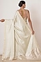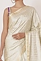 Featuring a light pista handwoven saree in pure banarasi silk base with chevron motifs and a gold embroidered border. It is paired with a contrasting violet blouse having gold zari embroidery.