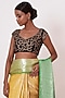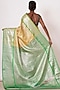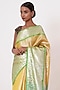 Featuring a pastel yellow handwoven saree in pure dharmavaram silk base with a light green zari embroidered border. It is paired with a contrasting brown velvet blouse having cap sleeves.