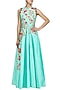 Featuring a turquoise blue front slit open flared anarkali jacket in silk base with floral motif resham embroidery on front. It is paired with matching palazzo pants in silk.