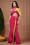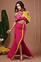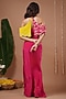 Featuring a yellow and hot pink asymmetric layered cape in heavy crepe base with beads, sequins, moti and resham embellishments. It is paired with a bustier and a straight skirt having a thigh-high slit. Accentuate it with zircon earrings and heels for a festive occasion or cocktail ceremony.