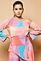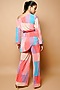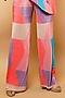 Featuring a multi-colored cold shoulder top in crush base. It is paired with matching high-waist straight pants and knitted thread handmade belt.