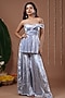 Featuring a sky blue off-shoulder asymmetric tunic in velvet base with a sweetheart neckline and floral thread embroidery. It is paired with flared kali palazzo pants. Accentuate it with dangler earrings and heels for a festive occasion.
