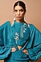 Featuring a teal maxi wrap dress in heavy crepe and net base. It is paired with a matching halter neck bustier having hand work.