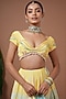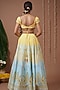 Featuring a yellow and firozi flared lehenga in natural crepe base with digital print. It is paired with a choli having a deep v-neckline and a glass organza ombre-dyed dupatta. Accentuate it with dangler earrings and heels for a festive occasion or wedding ceremony.