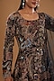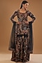 Featuring a black kurta in organza base with paper doll print and embellishments. It is paired with matching sharara pants and a cutwork dupatta.