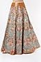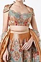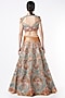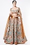 Featuring a copper kalidar lehenga in tissue base with applique embroidery. It is paired with a matching blouse and a cutwork dupatta.