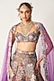 Featuring a copper metallic lehenga in tissue base with applique embellishments. It is paired with an embellished blouse and a tulle dupatta. Accentuate the designer lehenga with meenakari or polki jewellery, embellished heels and a potli bag for a bridal look, Perfect wear for your wedding, sangeet or engagement ceremony.
