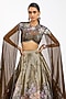 Featuring a copper metallic lehenga in tissue base with applique embellishments. It is paired with a tulle net embellished cape blouse. Accentuate the designer lehenga with silver or pastel jewellery, embellished heels and a potli bag for a bridal look, Perfect wear for your wedding, sangeet or engagement ceremony.