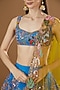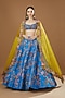 Featuring a cyan blue lehenga in raw silk and brocade base with applique embellishment. It is paired with a matching blouse and a contrasting cutwork dupatta.
