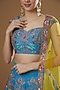Featuring a cyan blue kali lehenga in raw silk base with applique and embellishments. It is paired with a matching blouse and a contrasting cutwork dupatta.